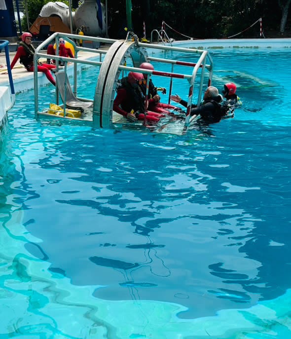 - ✓ Mise en situation professionnelle (crasch simulé dans l’eau avec immersion progressive, acte réflexe individuelle et collectif, avec visibilité, sans visibilité, cabine à plat, cabine retournée …).